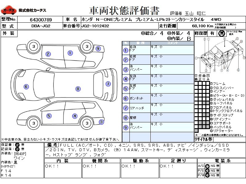 フル装備 / CD / 乗車定員(4人) / エアバッグ / 助手席エアバッグ / ABS / カーナビゲーション(インダッシュ,SSD,2DIN) / テレビ(アナログ) / 地デジTV / バックカメラ / アルミホイール(社外)(14インチ) / スマートキー / ディスチャージ / ウインカーミラー / ハイマウントストップランプ / フォグランプ /