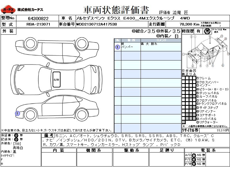 乗車定員(5人) / エアコン(オート) / パワーステアリング / パワーウィンドウ / 集中ドアロック / エアバッグ / 助手席エアバッグ / サイドエアバッグ / ABS / トラクションコントロール / クルーズコントロール / カーナビゲーション(インダッシュ,HDD,2DIN) / 地デジTV / バックカメラ(サイドカメラ) / ETC / アルミホイール(社外)(18インチ) / サンルーフ / 革シート(黒) / スマートキー / ウインカーミラー / ハイマウントストップランプ / パワーバックドア /