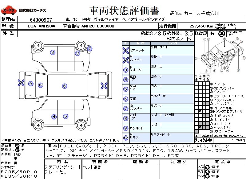 フル装備 / CD(社外) / 乗車定員(7人) / 集中ドアロック / エアバッグ / 助手席エアバッグ / ABS / トラクションコントロール / クルーズコントロール / カーナビゲーション(社外)(インダッシュ,SSD,2DIN) / 地デジTV(社外) / ETC / アルミホイール(18インチ) / ハーフレザーシート / スマートキー / ディスチャージ / パワースライドドア / フロントスポイラー /