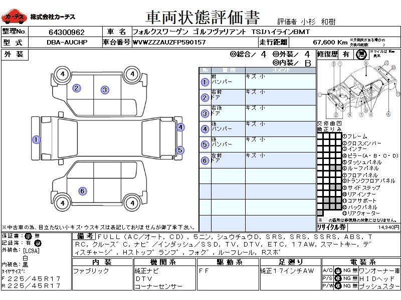 フル装備 / CD / 乗車定員(5人) / 集中ドアロック / エアバッグ / 助手席エアバッグ / サイドエアバッグ / ABS / トラクションコントロール / クルーズコントロール / カーナビゲーション(インダッシュ,SSD) / テレビ(アナログ) / 地デジTV / ETC / アルミホイール(17インチ) / スマートキー / ディスチャージ / ハイマウントストップランプ / フォグランプ / ルーフレール / リアスポイラー /