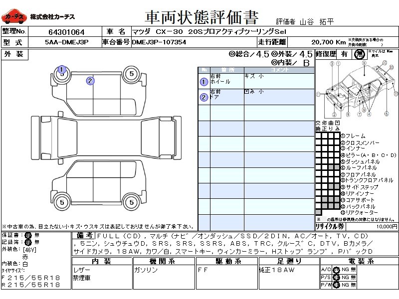 フル装備 / CD / マルチ(ナビ) / エアコン(オート) / テレビ(アナログ) / 乗車定員(5人) / 集中ドアロック / エアバッグ / 助手席エアバッグ / サイドエアバッグ / ABS / トラクションコントロール / クルーズコントロール / 地デジTV / バックカメラ(サイドカメラ) / ETC(社外) / アルミホイール(18インチ) / 革シート(白) / スマートキー / ウインカーミラー / ハイマウントストップランプ / パワーバックドア / リアスポイラー /