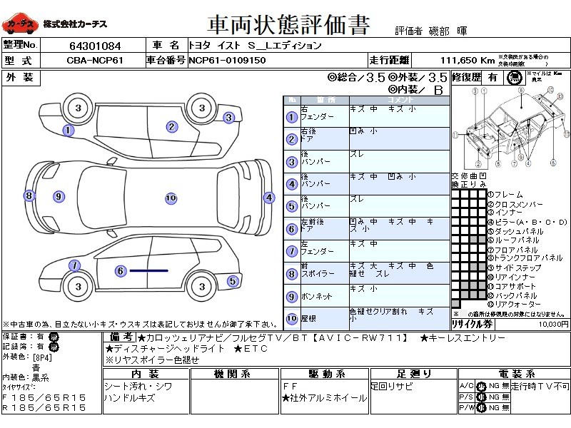 フル装備 / CD / 乗車定員(5人) / 集中ドアロック / エアバッグ / 助手席エアバッグ / ABS / カーナビゲーション(社外)(インダッシュ,SSD,2DIN) / 地デジTV(社外) / ETC(社外) / アルミホイール(社外)(15インチ) / キーレスエントリー / ディスチャージ / ハイマウントストップランプ / フォグランプ / フロントスポイラー / リアスポイラー / リアアンダースポイラー /