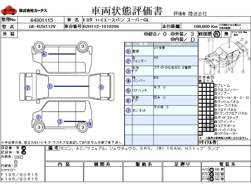 乗車定員(5人) / エアコン(マニュアル) / パワーステアリング / パワーウィンドウ / 集中ドアロック / エアバッグ / アルミホイール(社外)(15インチ) / ハイマウントストップランプ /