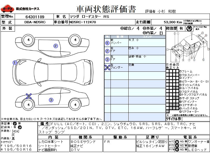 フル装備 / CD / 乗車定員(2人) / 集中ドアロック / エアバッグ / 助手席エアバッグ / ABS / トラクションコントロール / カーナビゲーション(オンダッシュ,SSD,2DIN) / テレビ(アナログ) / 地デジTV / ETC / アルミホイール(16インチ) / ハーフレザーシート / スマートキー / ハイマウントストップランプ /