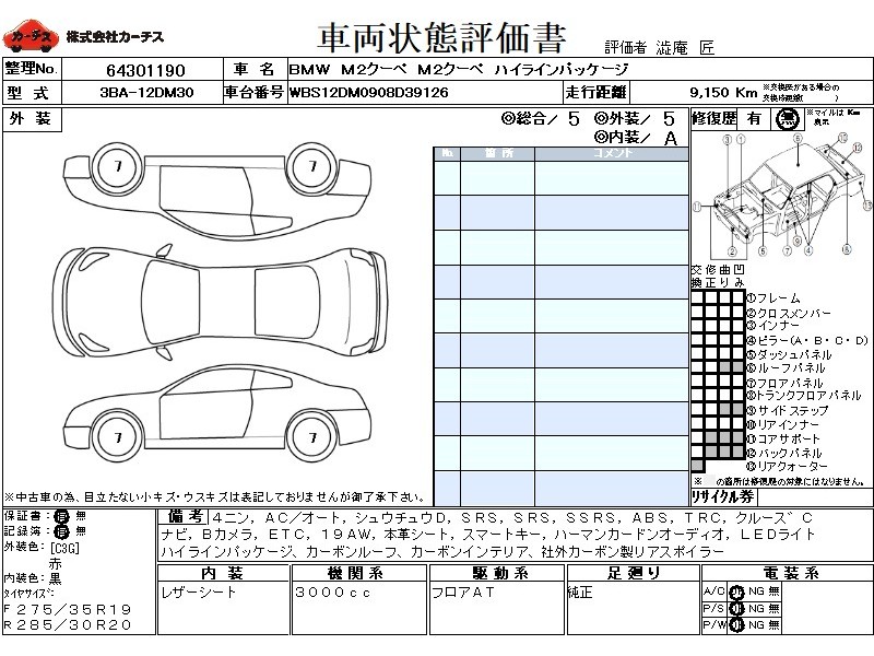 乗車定員(4人) / エアコン(オート) / パワーステアリング / パワーウィンドウ / 集中ドアロック / エアバッグ / 助手席エアバッグ / サイドエアバッグ / ABS / トラクションコントロール / クルーズコントロール / カーナビゲーション(インダッシュ,SSD,2DIN) / バックカメラ / ETC / アルミホイール(19インチ) / 革シート(黒) / スマートキー / リアスポイラー(社外) /