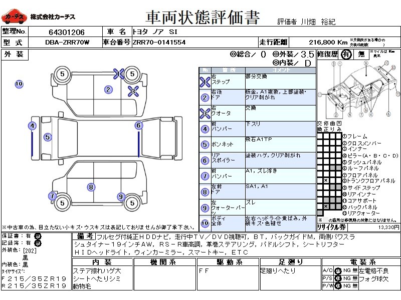 フル装備 / CD / マルチ(ナビ) / エアコン(オート) / 乗車定員(8人) / エアバッグ / 助手席エアバッグ / ABS / アルミホイール(社外)(19インチ) / スマートキー / ディスチャージ / パワースライドドア / フォグランプ / 足回り /