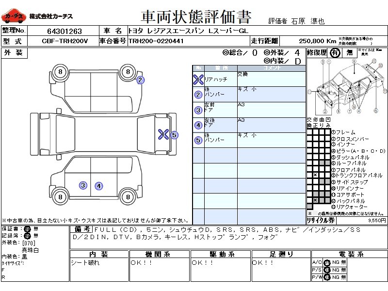 フル装備 / CD / 乗車定員(5人) / 集中ドアロック / エアバッグ / 助手席エアバッグ / ABS / カーナビゲーション(インダッシュ,SSD,2DIN) / 地デジTV / バックカメラ / ETC(社外) / キーレスエントリー / ハイマウントストップランプ / フォグランプ /