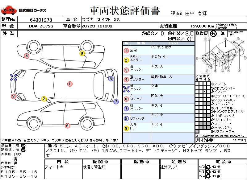 乗車定員(5人) / エアコン(オート) / パワーステアリング / CD(社外) / エアバッグ / 助手席エアバッグ / ABS / カーナビゲーション(社外)(インダッシュ,SSD,2DIN) / テレビ(社外) / ETC(社外) / アルミホイール(社外)(16インチ) / スマートキー / ディスチャージ / ハイマウントストップランプ / リアスポイラー /