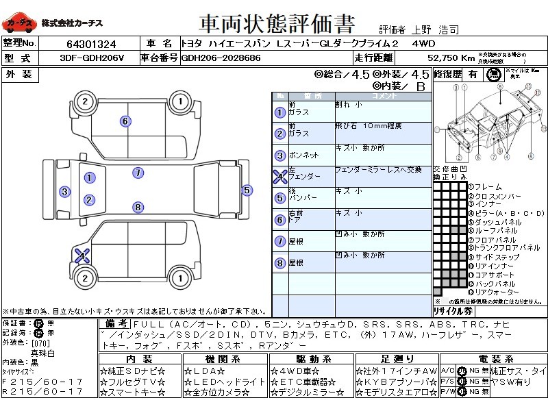 フル装備 / CD / 乗車定員(5人) / 集中ドアロック / エアバッグ / 助手席エアバッグ / ABS / トラクションコントロール / カーナビゲーション(インダッシュ,SSD,2DIN) / 地デジTV / バックカメラ / ETC / アルミホイール(社外)(17インチ) / ハーフレザーシート / スマートキー / フォグランプ / フロントスポイラー / サイドスポイラー / リアアンダースポイラー / 足回り /