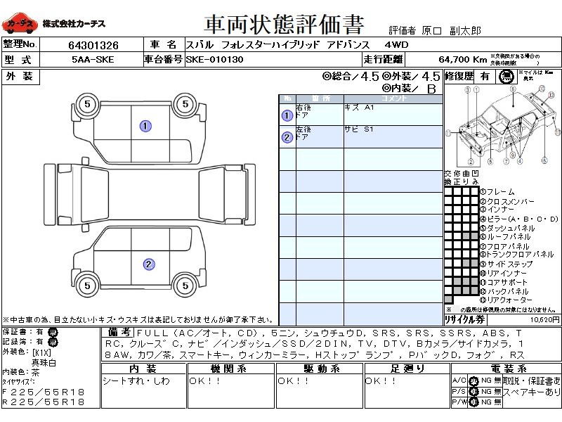 フル装備 / CD / 乗車定員(5人) / 集中ドアロック / エアバッグ / 助手席エアバッグ / サイドエアバッグ / ABS / トラクションコントロール / クルーズコントロール / カーナビゲーション(インダッシュ,SSD,2DIN) / テレビ(アナログ) / 地デジTV / バックカメラ(サイドカメラ) / ETC(社外) / アルミホイール(18インチ) / 革シート(茶) / スマートキー / ウインカーミラー / ハイマウントストップランプ / パワーバックドア / フォグランプ / リアスポイラー /