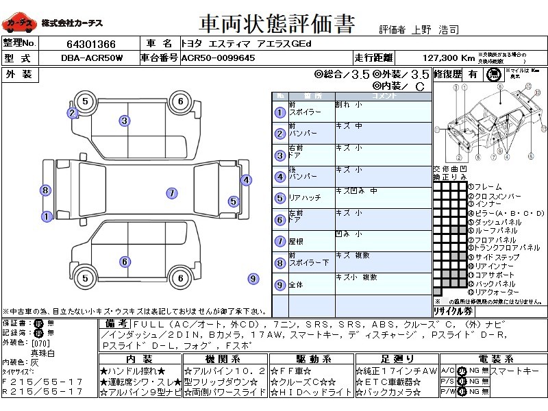 フル装備 / CD(社外) / 乗車定員(7人) / エアバッグ / 助手席エアバッグ / ABS / クルーズコントロール / カーナビゲーション(社外)(インダッシュ,2DIN) / 地デジTV(社外) / バックカメラ / ETC(社外) / アルミホイール(17インチ) / スマートキー / ディスチャージ / パワースライドドア / フォグランプ / フロントスポイラー /
