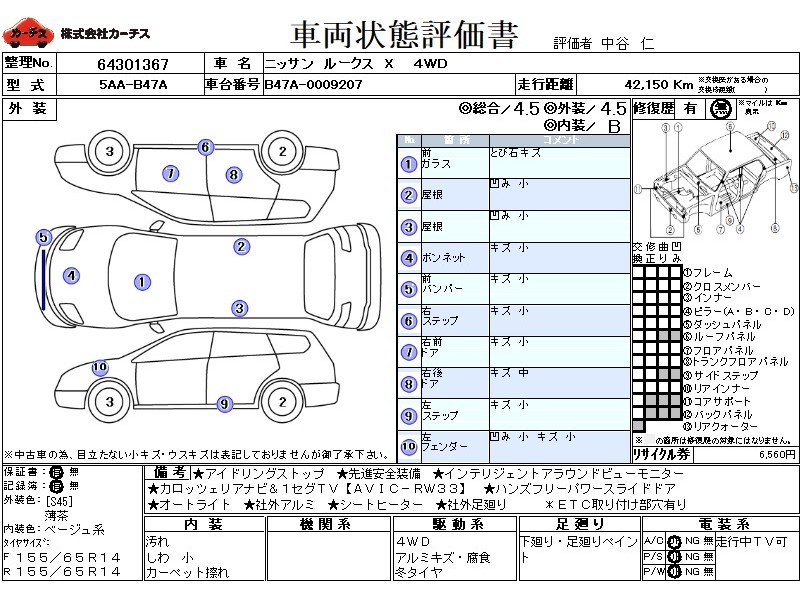 フル装備 / CD(社外) / 乗車定員(4人) / 集中ドアロック / エアバッグ / 助手席エアバッグ / サイドエアバッグ / ABS / トラクションコントロール / カーナビゲーション(社外)(インダッシュ,SSD,2DIN) / テレビ(社外) / バックカメラ(フロント) / アルミホイール(社外)(14インチ) / スマートキー / ウインカーミラー / ハイマウントストップランプ / パワースライドドア / 足回り /