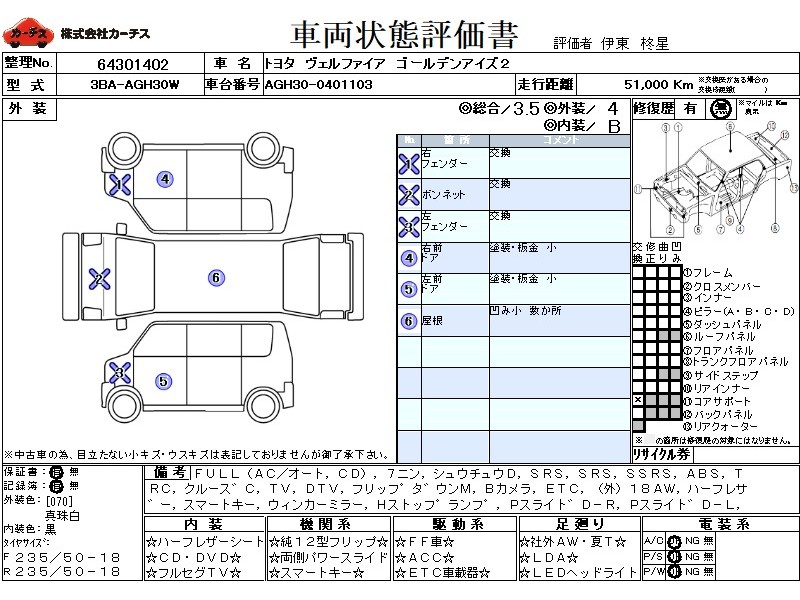 フル装備 / CD / 乗車定員(7人) / 集中ドアロック / エアバッグ / 助手席エアバッグ / サイドエアバッグ / ABS / トラクションコントロール / クルーズコントロール / テレビ(アナログ) / 地デジTV / フリップダウンモニタ / バックカメラ / ETC / アルミホイール(社外)(18インチ) / ハーフレザーシート / スマートキー / ウインカーミラー / ハイマウントストップランプ / パワースライドドア / パワーバックドア / フォグランプ / フロントスポイラー / サイドスポイラー / リアスポイラー / リアアンダースポイラー /