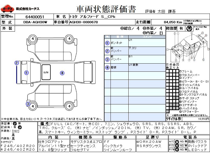 フル装備 / CD(社外) / 乗車定員(7人) / 集中ドアロック / エアバッグ / 助手席エアバッグ / サイドエアバッグ / ABS / トラクションコントロール / クルーズコントロール / カーナビゲーション(社外)(インダッシュ,2DIN) / テレビ(社外) / 地デジTV(社外) / ETC(社外) / アルミホイール(社外)(20インチ) / サンルーフ / 革シート(黒) / スマートキー / ウインカーミラー / ハイマウントストップランプ / パワースライドドア / パワーバックドア / フォグランプ / フロントスポイラー / サイドスポイラー / リアスポイラー / リアアンダースポイラー / 足回り /