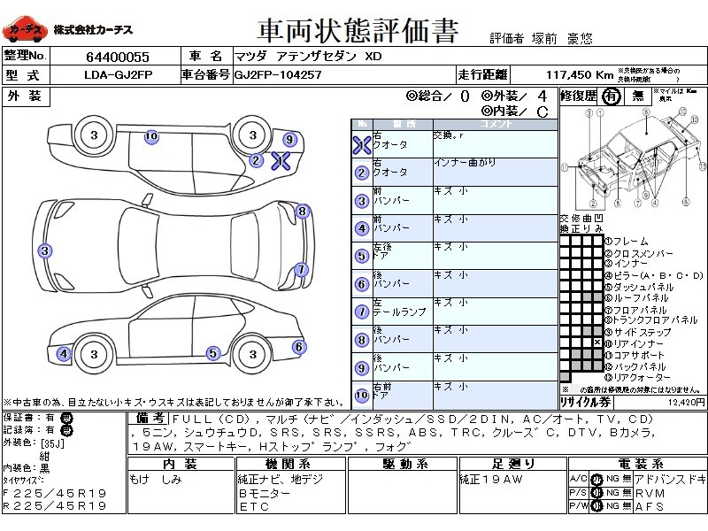 フル装備 / CD / マルチ(ナビ) / エアコン(オート) / テレビ(アナログ) / 乗車定員(5人) / 集中ドアロック / エアバッグ / 助手席エアバッグ / サイドエアバッグ / ABS / トラクションコントロール / クルーズコントロール / 地デジTV / バックカメラ / ETC(社外) / アルミホイール(19インチ) / スマートキー / ハイマウントストップランプ / フォグランプ /