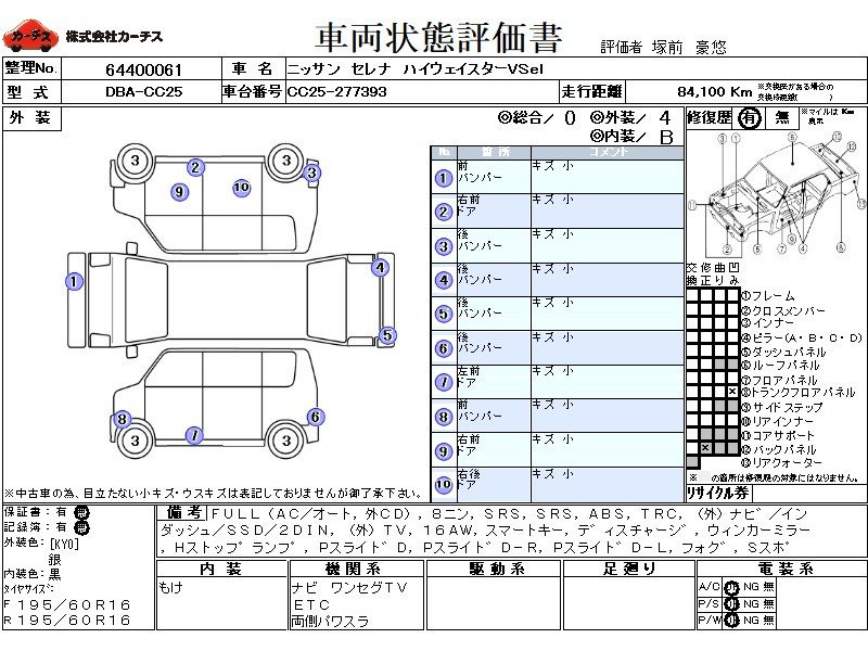 フル装備 / CD(社外) / 乗車定員(8人) / エアバッグ / 助手席エアバッグ / ABS / トラクションコントロール / カーナビゲーション(社外)(インダッシュ,SSD,2DIN) / テレビ(社外) / ETC(社外) / アルミホイール(16インチ) / スマートキー / ディスチャージ / ウインカーミラー / ハイマウントストップランプ / パワースライドドア / フォグランプ / サイドスポイラー /