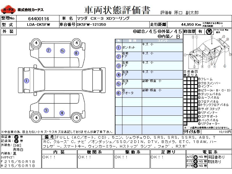 フル装備 / CD / 乗車定員(5人) / 集中ドアロック / エアバッグ / 助手席エアバッグ / サイドエアバッグ / ABS / トラクションコントロール / クルーズコントロール / カーナビゲーション(オンダッシュ,SSD,2DIN) / 地デジTV / バックカメラ / ETC / アルミホイール(18インチ) / ハーフレザーシート / スマートキー / ウインカーミラー / ハイマウントストップランプ / フォグランプ / リアスポイラー /