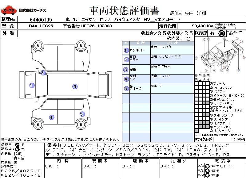 フル装備 / CD(社外) / 乗車定員(8人) / 集中ドアロック / エアバッグ / 助手席エアバッグ / ABS / トラクションコントロール / クルーズコントロール / カーナビゲーション(社外)(インダッシュ,SSD,2DIN) / テレビ(社外) / 地デジTV(社外) / ETC(社外) / アルミホイール(社外)(18インチ) / スマートキー / ディスチャージ / ウインカーミラー / ハイマウントストップランプ / パワースライドドア / フォグランプ / フロントスポイラー / サイドスポイラー / リアスポイラー /