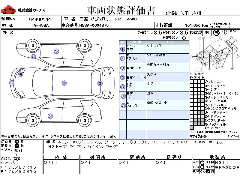 乗車定員(4人) / エアコン(マニュアル) / クーラー / パワーウィンドウ / 集中ドアロック / CD / エアバッグ / 助手席エアバッグ / アルミホイール(15インチ) / キーレスエントリー / ハイマウントストップランプ / 背面タイヤ / フォグランプ /