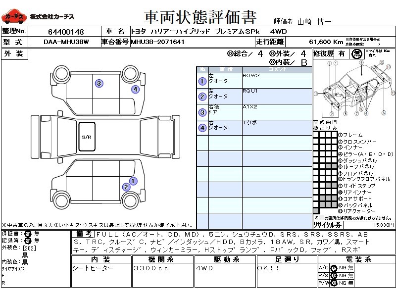 フル装備 / CD / MD / 乗車定員(5人) / 集中ドアロック / エアバッグ / 助手席エアバッグ / サイドエアバッグ / ABS / トラクションコントロール / クルーズコントロール / カーナビゲーション(インダッシュ,HDD) / バックカメラ / ETC(社外) / アルミホイール(18インチ) / サンルーフ / 革シート(黒) / スマートキー / ディスチャージ / ウインカーミラー / ハイマウントストップランプ / パワーバックドア / フォグランプ / リアスポイラー /