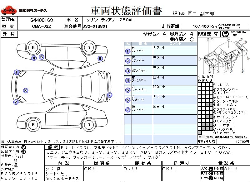 フル装備 / CD / マルチ(ナビ) / エアコン(マニュアル) / 乗車定員(5人) / 集中ドアロック / エアバッグ / 助手席エアバッグ / サイドエアバッグ / ABS / バックカメラ(サイドカメラ) / ETC / アルミホイール(16インチ) / スマートキー / ウインカーミラー / ハイマウントストップランプ / フォグランプ /