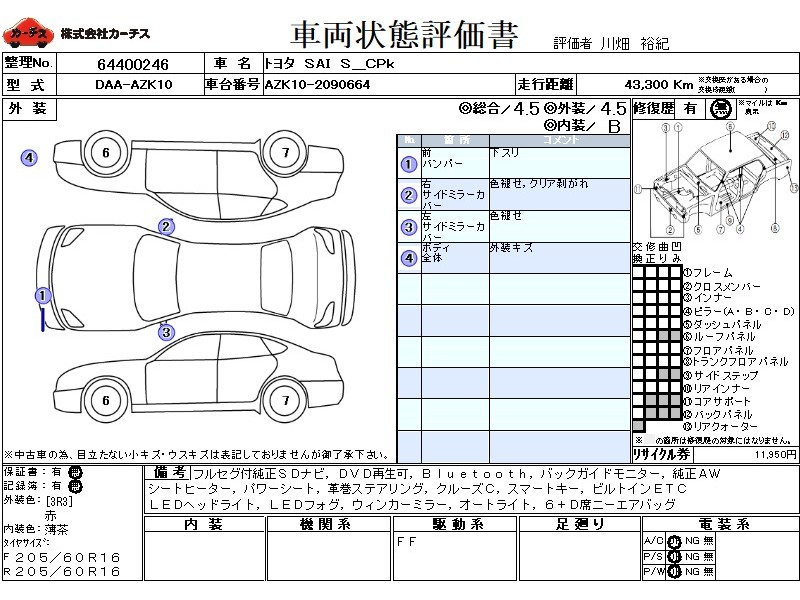 フル装備 / CD / 乗車定員(5人) / エアバッグ / 助手席エアバッグ / サイドエアバッグ / ABS / クルーズコントロール / カーナビゲーション(SSD) / テレビ(アナログ) / 地デジTV / バックカメラ / ETC / アルミホイール(16インチ) / スマートキー / ウインカーミラー / ハイマウントストップランプ / フォグランプ /