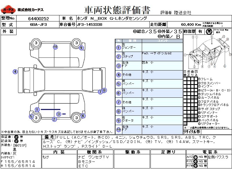 フル装備 / CD(社外) / 乗車定員(4人) / 集中ドアロック / エアバッグ / 助手席エアバッグ / ABS / トラクションコントロール / クルーズコントロール / カーナビゲーション(社外)(インダッシュ,SSD,2DIN) / テレビ(社外) / ETC(社外) / アルミホイール(社外)(14インチ) / スマートキー / ハイマウントストップランプ / パワースライドドア /