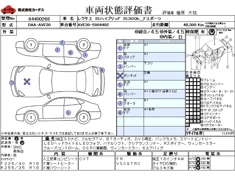 フル装備 / CD / エアバッグ / 助手席エアバッグ / サイドエアバッグ / ABS / トラクションコントロール / クルーズコントロール / カーナビゲーション(インダッシュ) / 地デジTV / バックカメラ / ETC / アルミホイール(18インチ) / スマートキー / フォグランプ / リアスポイラー /