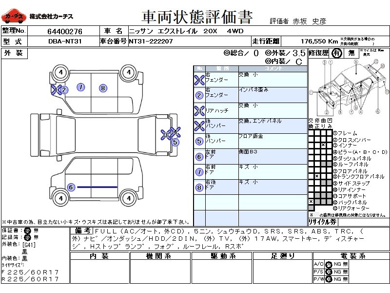 フル装備 / CD(社外) / 乗車定員(5人) / 集中ドアロック / エアバッグ / 助手席エアバッグ / ABS / トラクションコントロール / カーナビゲーション(社外)(オンダッシュ,HDD,2DIN) / テレビ(社外) / 地デジTV(社外) / ETC(社外) / アルミホイール(社外)(17インチ) / スマートキー / ディスチャージ / ハイマウントストップランプ / フォグランプ / ルーフレール / リアスポイラー /