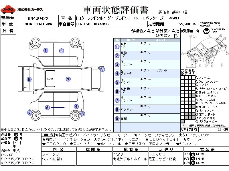 乗車定員(5人) / エアコン(オート) / パワーステアリング / パワーウィンドウ / 集中ドアロック / エアバッグ / 助手席エアバッグ / サイドエアバッグ / ABS / トラクションコントロール / クルーズコントロール / カーナビゲーション(インダッシュ,SSD,2DIN) / バックカメラ(サイドカメラ) / ETC / アルミホイール(社外)(20インチ) / サンルーフ / 革シート(黒) / スマートキー / ウインカーミラー / ハイマウントストップランプ / フォグランプ / ルーフレール / フロントスポイラー(社外) / リアスポイラー(社外) / リアアンダースポイラー(社外) / マフラー(社外) /