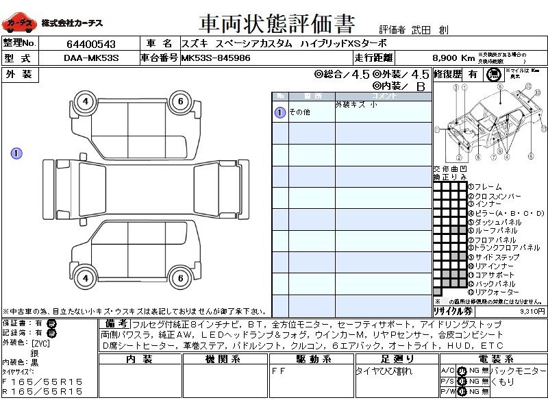 フル装備 / CD / 乗車定員(4人) / エアバッグ / 助手席エアバッグ / サイドエアバッグ / ABS / トラクションコントロール / クルーズコントロール / カーナビゲーション(SSD) / テレビ(アナログ) / 地デジTV / バックカメラ / ETC(社外) / アルミホイール(15インチ) / スマートキー / ウインカーミラー / ハイマウントストップランプ / パワースライドドア / フォグランプ / サイドスポイラー / リアスポイラー /