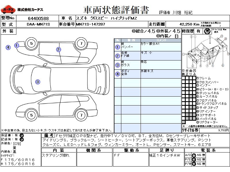 フル装備 / CD / 乗車定員(5人) / エアバッグ / 助手席エアバッグ / サイドエアバッグ / ABS / クルーズコントロール / カーナビゲーション(SSD) / テレビ(アナログ) / 地デジTV / バックカメラ(フロント) / アルミホイール(16インチ) / スマートキー / ウインカーミラー / ハイマウントストップランプ / フォグランプ /