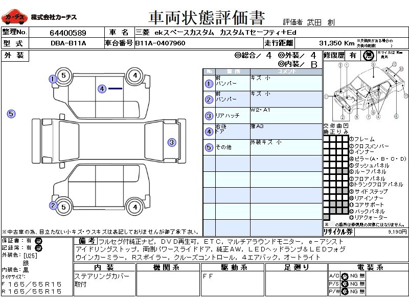 フル装備 / CD / 乗車定員(4人) / エアバッグ / 助手席エアバッグ / サイドエアバッグ / ABS / トラクションコントロール / クルーズコントロール / カーナビゲーション(SSD) / テレビ(アナログ) / 地デジTV / バックカメラ / ETC(社外) / アルミホイール(15インチ) / スマートキー / ウインカーミラー / ハイマウントストップランプ / パワースライドドア / フォグランプ / サイドスポイラー / リアスポイラー /