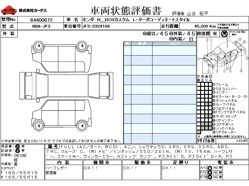 フル装備 / CD(社外) / 乗車定員(4人) / 集中ドアロック / エアバッグ / 助手席エアバッグ / サイドエアバッグ / ABS / トラクションコントロール / クルーズコントロール / カーナビゲーション(社外)(インダッシュ,SSD,2DIN) / テレビ(社外) / 地デジTV(社外) / ETC(社外) / アルミホイール(15インチ) / ハーフレザーシート / スマートキー / ウインカーミラー / ハイマウントストップランプ / パワースライドドア / フォグランプ / サイドスポイラー / リアスポイラー /