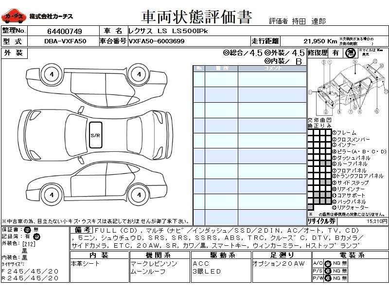 フル装備 / CD / マルチ(ナビ) / エアコン(オート) / テレビ(アナログ) / 乗車定員(5人) / 集中ドアロック / エアバッグ / 助手席エアバッグ / サイドエアバッグ / ABS / トラクションコントロール / クルーズコントロール / 地デジTV / バックカメラ(サイドカメラ) / ETC / アルミホイール(20インチ) / サンルーフ / 革シート(黒) / スマートキー / ウインカーミラー / ハイマウントストップランプ / パワーバックドア / フォグランプ /