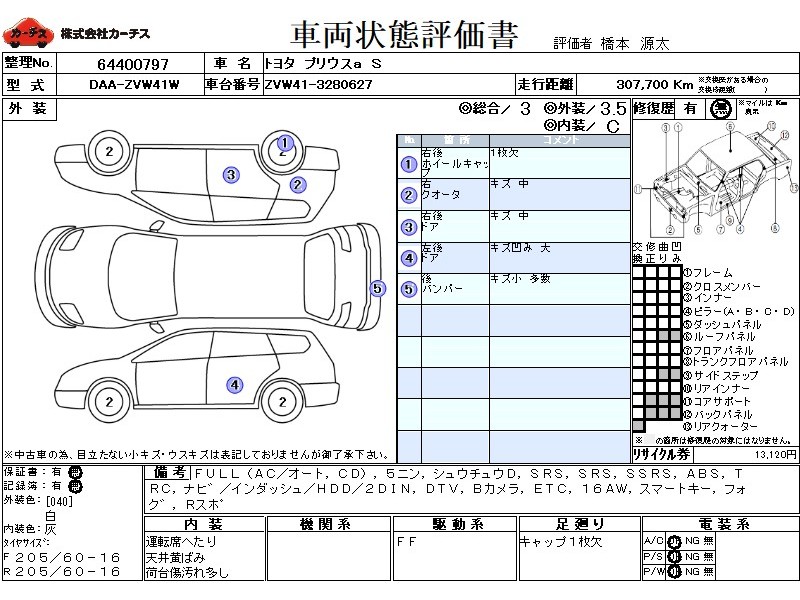 フル装備 / CD / 乗車定員(5人) / 集中ドアロック / エアバッグ / 助手席エアバッグ / サイドエアバッグ / ABS / トラクションコントロール / カーナビゲーション(インダッシュ,HDD,2DIN) / 地デジTV / バックカメラ / ETC / アルミホイール(16インチ) / スマートキー / フォグランプ / リアスポイラー /