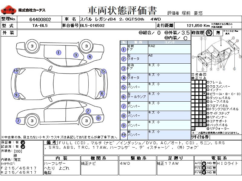 フル装備 / CD / マルチ(ナビ) / エアコン(オート) / 乗車定員(5人) / エアバッグ / 助手席エアバッグ / ABS / トラクションコントロール / ETC(社外) / アルミホイール(17インチ) / ハーフレザーシート / ディスチャージ / フォグランプ(社外) /