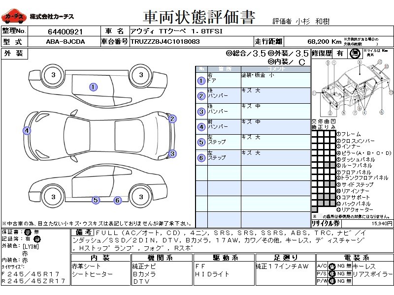 フル装備 / CD / 乗車定員(4人) / エアバッグ / 助手席エアバッグ / サイドエアバッグ / ABS / トラクションコントロール / カーナビゲーション(インダッシュ,SSD,2DIN) / 地デジTV / バックカメラ / ETC(社外) / アルミホイール(17インチ) / 革シート(その他) / キーレスエントリー / ディスチャージ / ハイマウントストップランプ / フォグランプ / リアスポイラー /