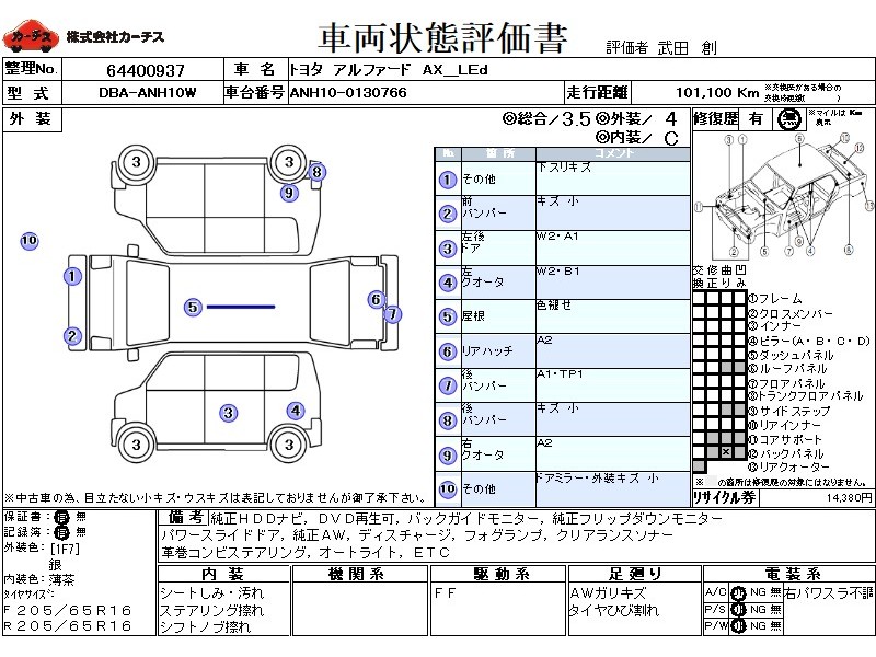 フル装備 / CD / MD / 乗車定員(8人) / エアバッグ / 助手席エアバッグ / ABS / カーナビゲーション(HDD) / フリップダウンモニタ / ETC / アルミホイール(16インチ) / キーレスエントリー / ディスチャージ / ハイマウントストップランプ / パワースライドドア / フォグランプ / リアスポイラー /