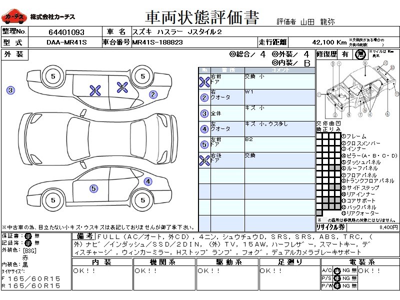 フル装備 / CD(社外) / 乗車定員(4人) / 集中ドアロック / エアバッグ / 助手席エアバッグ / ABS / トラクションコントロール / カーナビゲーション(社外)(インダッシュ,SSD,2DIN) / テレビ(社外) / 地デジTV(社外) / ETC(社外) / アルミホイール(15インチ) / ハーフレザーシート / スマートキー / ディスチャージ / ウインカーミラー / ハイマウントストップランプ / フォグランプ /