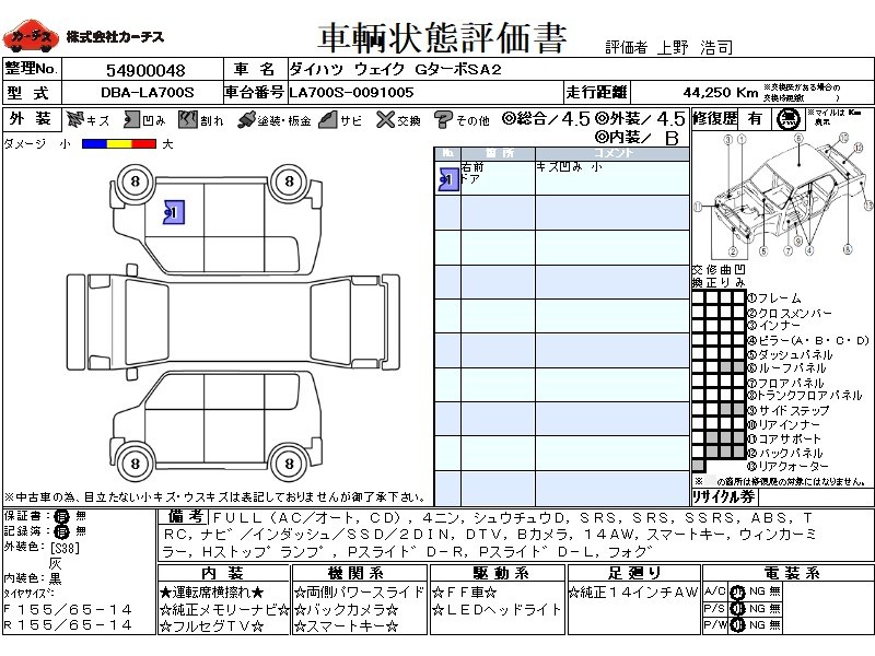 フル装備 / CD / 乗車定員(4人) / 集中ドアロック / エアバッグ / 助手席エアバッグ / サイドエアバッグ / ABS / トラクションコントロール / カーナビゲーション(インダッシュ,SSD,2DIN) / 地デジTV / バックカメラ / ETC(社外) / アルミホイール(14インチ) / スマートキー / ウインカーミラー / ハイマウントストップランプ / パワースライドドア / フォグランプ /