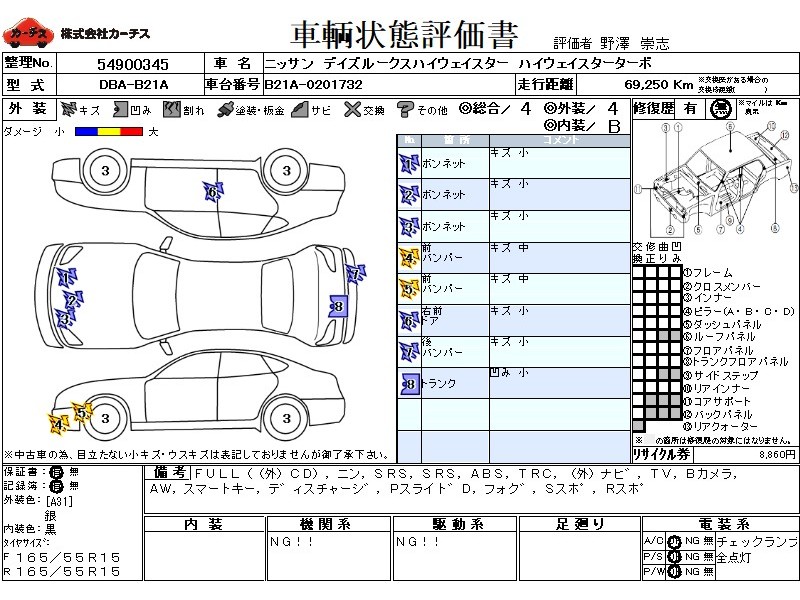 フル装備 / CD(社外) / 乗車定員 / エアバッグ / 助手席エアバッグ / ABS / トラクションコントロール / カーナビゲーション(社外) / テレビ(アナログ) / バックカメラ / ETC(社外) / アルミホイール / スマートキー / ディスチャージ / パワースライドドア / フォグランプ / サイドスポイラー / リアスポイラー /