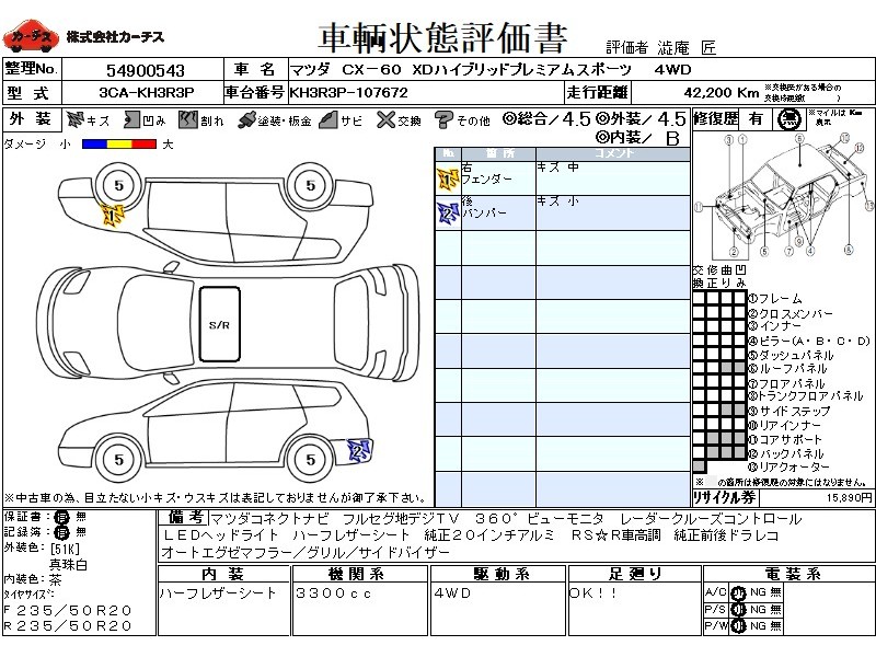 乗車定員(5人) / エアコン(オート) / パワーステアリング / パワーウィンドウ / 集中ドアロック / エアバッグ / 助手席エアバッグ / サイドエアバッグ / ABS / トラクションコントロール / クルーズコントロール / カーナビゲーション(オンダッシュ,SSD) / 地デジTV / バックカメラ(サイドカメラ) / ETC / アルミホイール(20インチ) / サンルーフ / ハーフレザーシート / スマートキー / ハイマウントストップランプ / パワーバックドア / リアスポイラー / マフラー(社外) / 足回り /