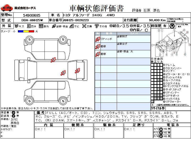 フル装備 / CD / 乗車定員(7人) / 集中ドアロック / エアバッグ / 助手席エアバッグ / サイドエアバッグ / ABS / トラクションコントロール / クルーズコントロール / カーナビゲーション(インダッシュ,HDD,2DIN) / テレビ(アナログ) / フリップダウンモニタ / バックカメラ / ETC / アルミホイール(社外)(20インチ) / スマートキー / ディスチャージ / パワースライドドア / フォグランプ / フロントスポイラー / サイドスポイラー / リアスポイラー / リアアンダースポイラー /
