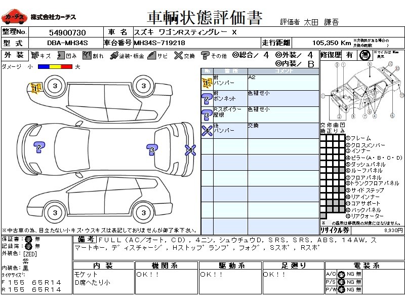 フル装備 / CD / 乗車定員(4人) / 集中ドアロック / エアバッグ / 助手席エアバッグ / ABS / アルミホイール(14インチ) / スマートキー / ディスチャージ / ハイマウントストップランプ / フォグランプ / サイドスポイラー / リアスポイラー /