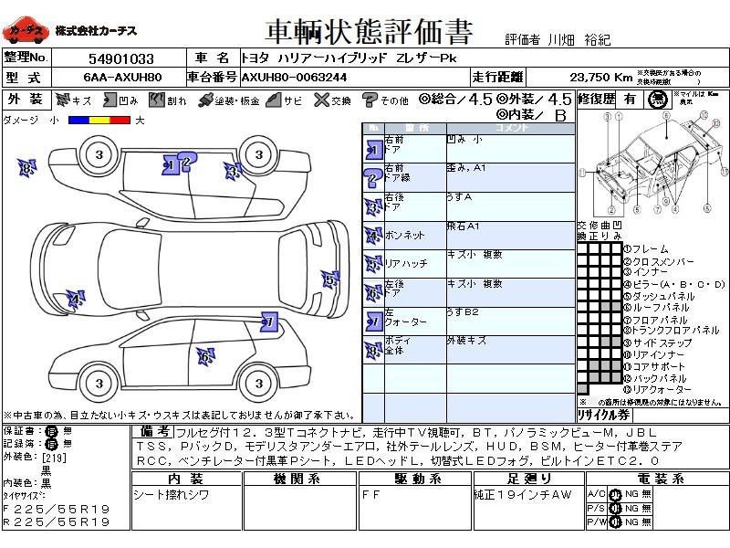 乗車定員(5人) / エアコン(オート) / パワーステアリング / パワーウィンドウ / エアバッグ / 助手席エアバッグ / サイドエアバッグ / ABS / クルーズコントロール / カーナビゲーション(SSD) / テレビ(アナログ) / 地デジTV / バックカメラ(サイドカメラ) / ETC / アルミホイール(19インチ) / 革シート(黒) / スマートキー / ウインカーミラー / ハイマウントストップランプ / パワーバックドア / フォグランプ / フロントスポイラー(社外) / サイドスポイラー(社外) / リアスポイラー / リアアンダースポイラー(社外) /