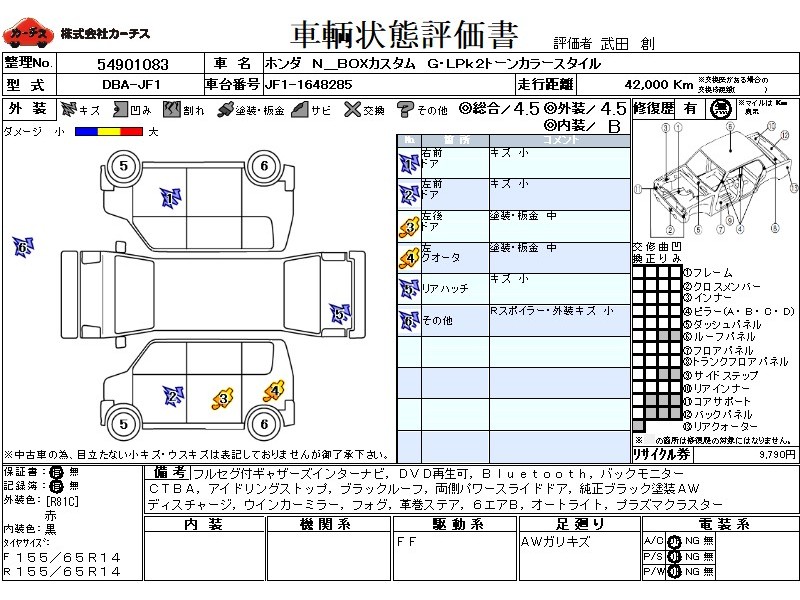 フル装備 / CD / 乗車定員(4人) / エアバッグ / 助手席エアバッグ / サイドエアバッグ / ABS / カーナビゲーション(SSD) / テレビ(アナログ) / 地デジTV / バックカメラ / アルミホイール(14インチ) / スマートキー / ディスチャージ / ウインカーミラー / ハイマウントストップランプ / パワースライドドア / フォグランプ / サイドスポイラー / リアスポイラー /
