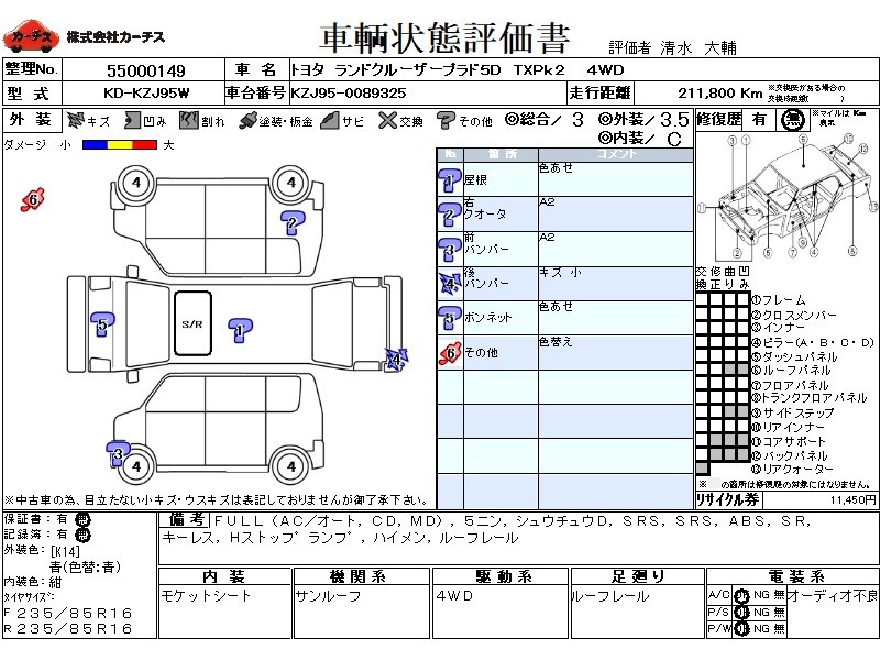 フル装備 / CD / MD / 乗車定員(5人) / 集中ドアロック / エアバッグ / 助手席エアバッグ / ABS / ETC(社外) / サンルーフ / キーレスエントリー / ハイマウントストップランプ / 背面タイヤ / ルーフレール /