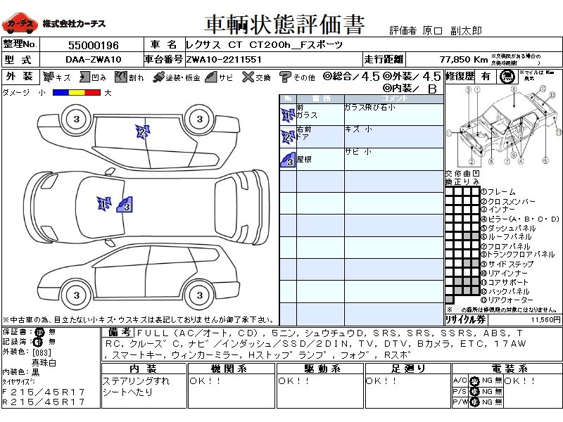 フル装備 / CD / 乗車定員(5人) / 集中ドアロック / エアバッグ / 助手席エアバッグ / サイドエアバッグ / ABS / トラクションコントロール / クルーズコントロール / カーナビゲーション(インダッシュ,SSD,2DIN) / テレビ(アナログ) / 地デジTV / バックカメラ / ETC / アルミホイール(17インチ) / スマートキー / ウインカーミラー / ハイマウントストップランプ / フォグランプ / リアスポイラー /