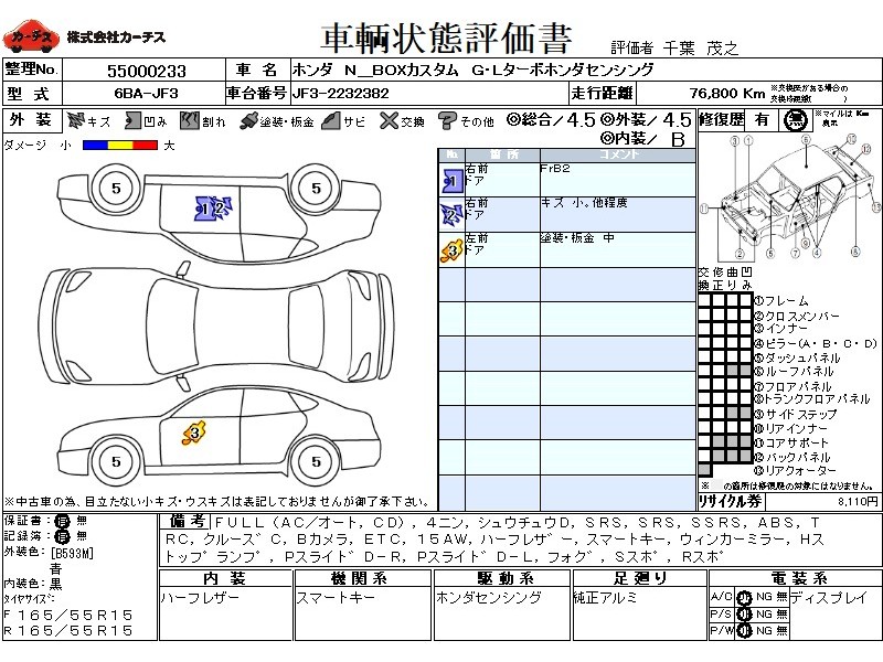 フル装備 / CD / 乗車定員(4人) / 集中ドアロック / エアバッグ / 助手席エアバッグ / サイドエアバッグ / ABS / トラクションコントロール / クルーズコントロール / バックカメラ / ETC / アルミホイール(15インチ) / ハーフレザーシート / スマートキー / ウインカーミラー / ハイマウントストップランプ / パワースライドドア / フォグランプ / サイドスポイラー / リアスポイラー /